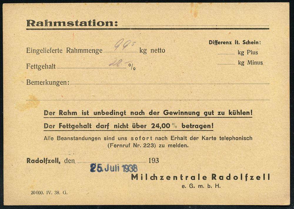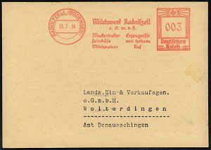 5488 | 20 € | POSTLEITRAUM 7700 (OHNE SINGEN) : RADOLFZELL (BODENSEE)/ Milchwerk Radolfzell/ ..Markenbutter/ Feinkäse/ Milchpulver.. 1938 (25.7.) AFS Francotyp "Hakenkreuz" klar auf . interess. Meßkarte für Rahm- u. Fettmengen (Dü.E-3CE) | ![]() ![]() | |
