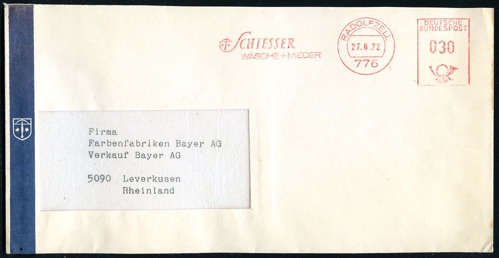 5495 | 10 € | POSTLEITRAUM 7700 (OHNE SINGEN) : 775 RADOLFZELL/ SCHIESSER/ WÄSCHE + MIEDER 1972 (17.6.) AFS Francotyp (Firmen-Logo: Armbrust) motivgl. Firmen-Bf. (Dü.E-26) | ![]() | |