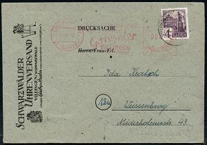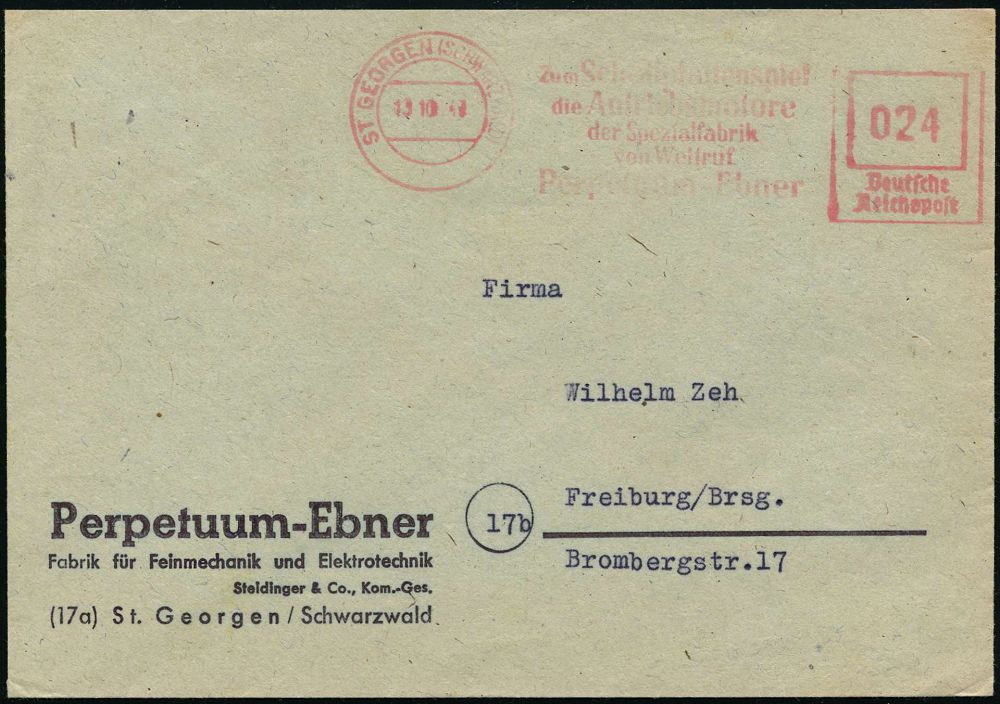 5502 | 25 € | POSTLEITRAUM 7700 (OHNE SINGEN) : ST GEORGEN (SCHWARZWALD)/ ..Spezialfabrik/ von Weltrzf/ Perpetuum-Ebner 1947 (13.10.) seltener, aptierter AFS Francotyp "Reichsadler" = entfernt (zeitbedingt teils etw. schwach) Firmen-Bf.: Perpetuum-Ebne, Fabrik für Feinmechanik u. Elektrotechnik (Dü.E-13 R-129o) | ![]() | |