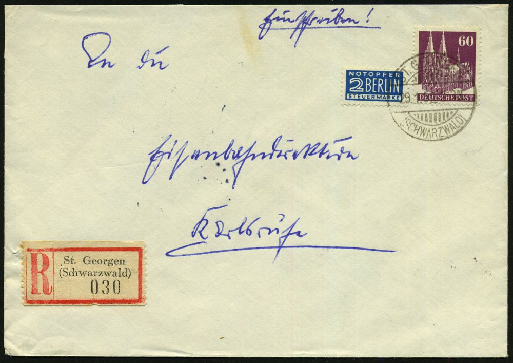 5503 | 14 € | POSTLEITRAUM 7700 (OHNE SINGEN) : ST.GEORGEN/ (SCHWARZWALD) 1952 (29.1.) alter 1K-Gitter weiterverwendet auf EF 60 Pf. Kölner Dom + 2 Pf. NoB + teilgez. RZ: St. Georgen/(Schwarzwlad), Fern-R-Bf. (Mi.93 eg EF) | ![]() | |