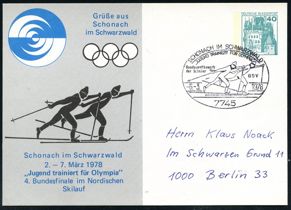 5510 | 15 € | POSTLEITRAUM 7700 (OHNE SINGEN) : 7745 SCHONACH../ "JUGEND TRAINIERT FÜR OLYMPIA".. 1978 (6.3.) SSt (Langläufer) a. motivgl. PP 40 Pf.: 4.Bundes-finale im Nord.Skilauf/"Jugend trainiert f.Olympia" (2 Langläufer) Inl.-Karte (Mi.PP 100/59) | ![]() | |