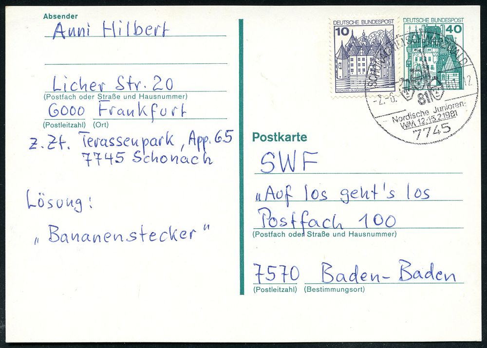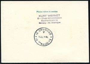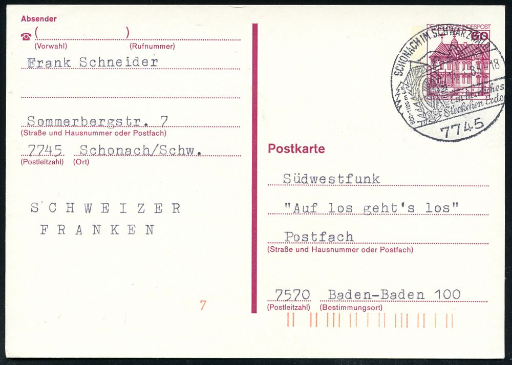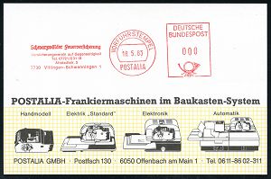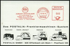 5471 | 18 € | POSTLEITRAUM 7700 (OHNE SINGEN) : 7750 Konstanz 1979 (10.10.) AFS: VORFÜHSTEMPEL/POSTALIA/ONA/AUSKUNFTEI-DETEKTEI NAHR.. , seltene Postalia-Musterkt.! (= Specimen) | ![]() | |