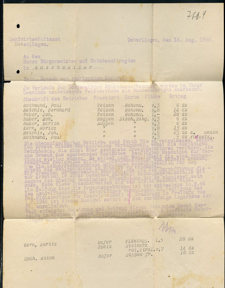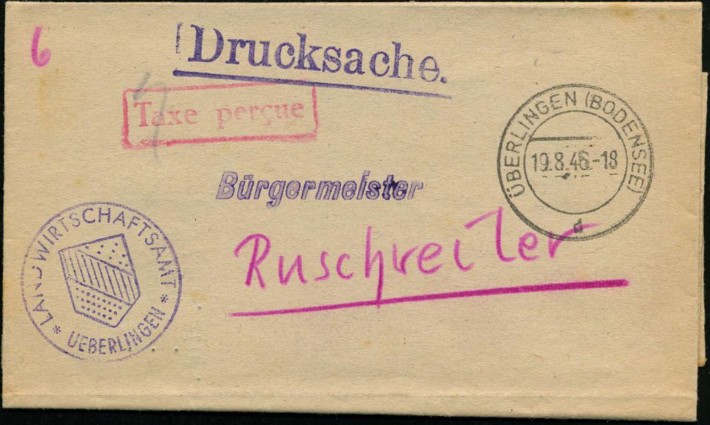 5526 | 14 € | POSTLEITRAUM 7700 (OHNE SINGEN) : ÜBERLINGEN (BODENSEE)/ d 1946 (19.8.) 2K-Steg + roter Ra.: Taxe percue + viol. Abs.-1K: LANDWIRTSCHAFTSAMT.. (Wappen) Falt-Bf. mit Inhalt: Saatgut-Hinweise | ![]() ![]() | |