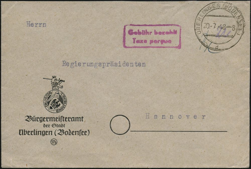 5527 | 14 € | POSTLEITRAUM 7700 (OHNE SINGEN) : ÜBERLINGEN (BODENSEE)/ d 1948 (20.7.) 2-StegK + viol. Ra.2: Gebühr bezahlt/Taxe percue klar auf dekorativem Kommunal-Bf.: Bürgermeisteramt.. mit Wappenlöwe n. Hannover | ![]() | |