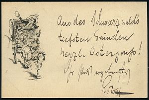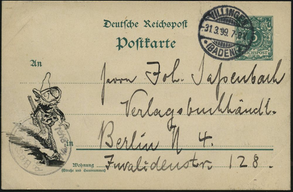 5533 | 30 € | POSTLEITRAUM 7700 (OHNE SINGEN) : VILLINGEN/ *(BADEN)/ b 1899 (31.3.) 1K-Gitter auf amtl. P 5 Pf. Krone, grün vs./rs. Handmalerei: Tusch-Federzeichnung (Wanderer mit Hut) rs.: Kutsche (kl. Mäng. kaum sichtbar) seltene Inl.-Kt. n.Berlin (Mi.P 36) | ![]() ![]() | |