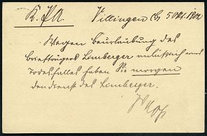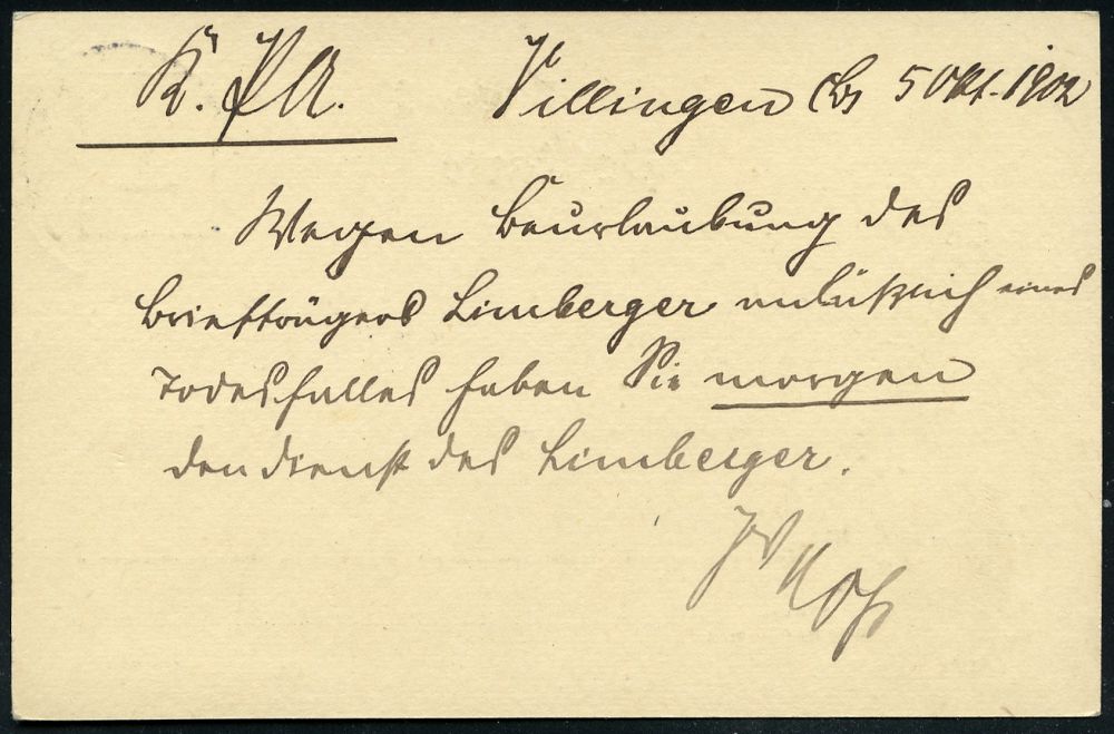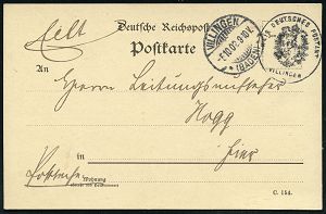 5534 | 18 € | POSTLEITRAUM 7700 (OHNE SINGEN) : VILLINGEN/ *(BADEN)* 1902 (5.10.) 1K-Gitter + schw. Oval-Siegel-HdN: KAIS. DEUTSCHES POSTAMT/ VILLINGEN (Brustschild-Adler) Orts-Dienstkt. (Form C. 154.) | ![]() ![]() | |