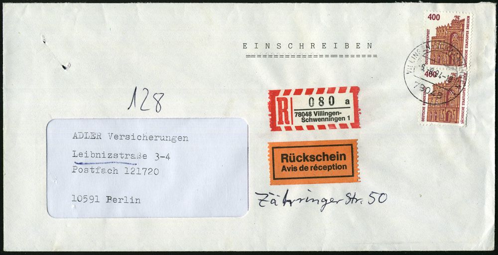 5549 | 15 € | POSTLEITRAUM 7700 (OHNE SINGEN) : 78048 VILLINGEN-SCHWENNINGEN 1/ e 1994 (6.8.) 1K-Segment auf Paar 400 Pf. Staatsoper Dresden + RZ: 78046 Villingen-/Schwenningen 1/a (neue PLZ. Naßklebezettel), Inl.-R-Bf. "Rückschein" (Mi.1562 MeF, + 10.- EUR) | ![]() | |