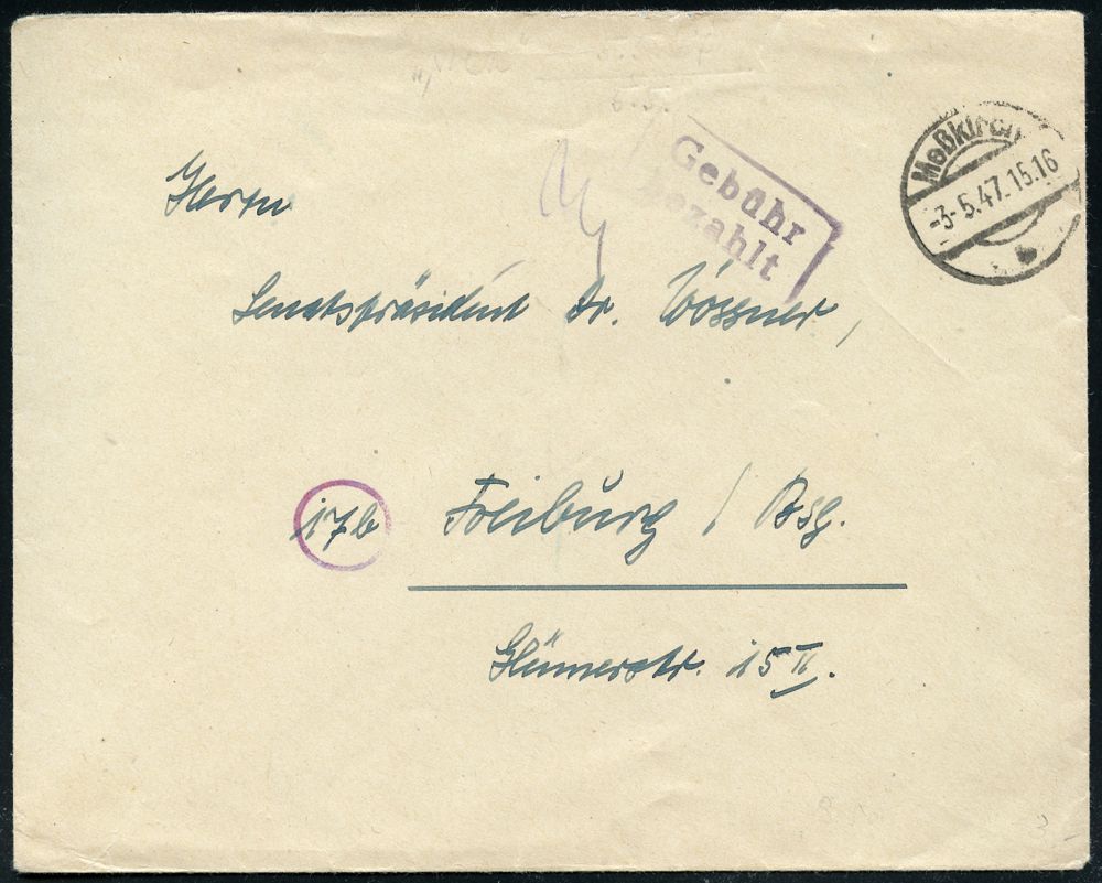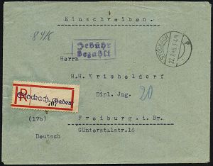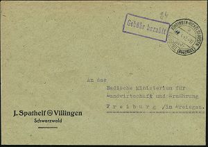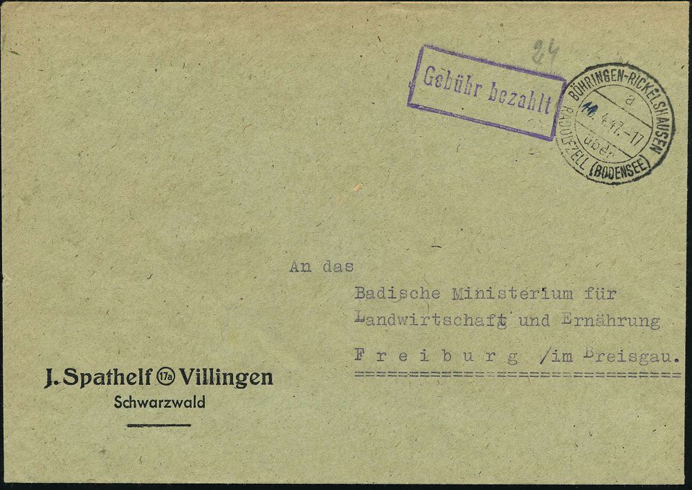 5376 | 15 € | POSTLEITRAUM 7700 (OHNE SINGEN) : BÖHRINGEN-RICKELSHAUSEN/ a/ über/ RADOLFZELL (BODENSEE) 1947 (11.4.) 2K-Steg = PSt.I + viol. Ra.: Gebühr bezahlt (Datum hs. korrigiert) Firmen-Fern-Bf.: J. Spathelf (17 a) Villingen.. | ![]() | |