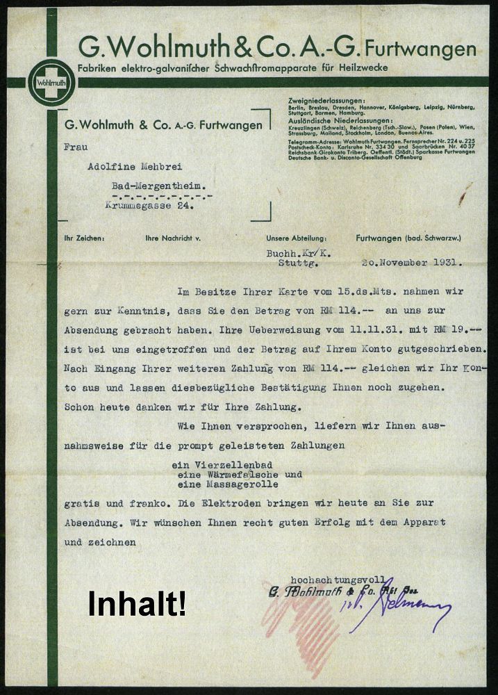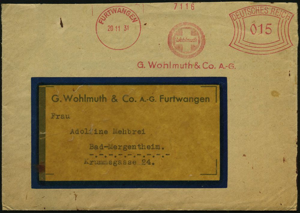 5386 | 28 € | POSTLEITRAUM 7700 (OHNE SINGEN) : FURTWANGEN/ G.Wohlmuth & Co AG. 1931 (20.11.) AFS Francotyp "Bogenrechteck" (weißes Kreuz auf rotem Grund) (Bf rs. kl. Mäng.) Firmen-Bf. + Inhalt: dekorativer Briefbogen = Fabrik elektro-galvanischer Heilapparate), 2 Belege kompl. (Dü.E-1CEh) | ![]() ![]() | |
