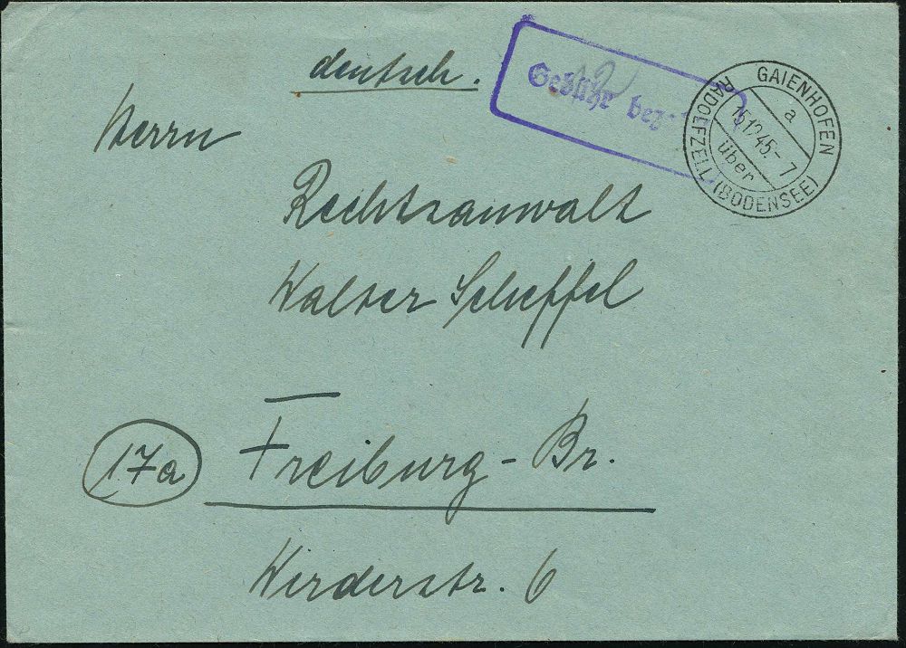 5390 | 12 € | POSTLEITRAUM 7700 (OHNE SINGEN) : GAIENHOFEN/ a/ über/ RADOLFZELL (BODENSEE) 1945 (15.12.) 2K-Steg = PSt.I + viol. Ra.: Gebühr bezahlt (gotisch) Barfrankatur-Fernbf. n. Freiburg/Br. | ![]() | |
