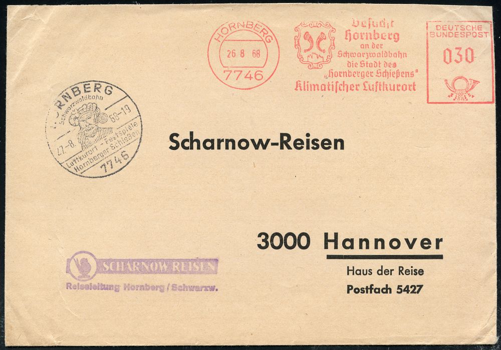 5414 | 15 € | POSTLEITRAUM 7700 (OHNE SINGEN) : 7746 HORNBERG/ ..die Stadt des/ "Hornberger Schießens".. 1969 (26.8.) AFS Francotyp + HWSt: HORNBERG/ Schwarzwaldbahn/ ..Festspiele/Hornberger Schießen (Landsknecht, Bo.3) = Datumskorrektur des Freistempels! zus. auf Firmen-Bf.: Scharnow-Reisen.. (Dü.E-23CG) | ![]() | |