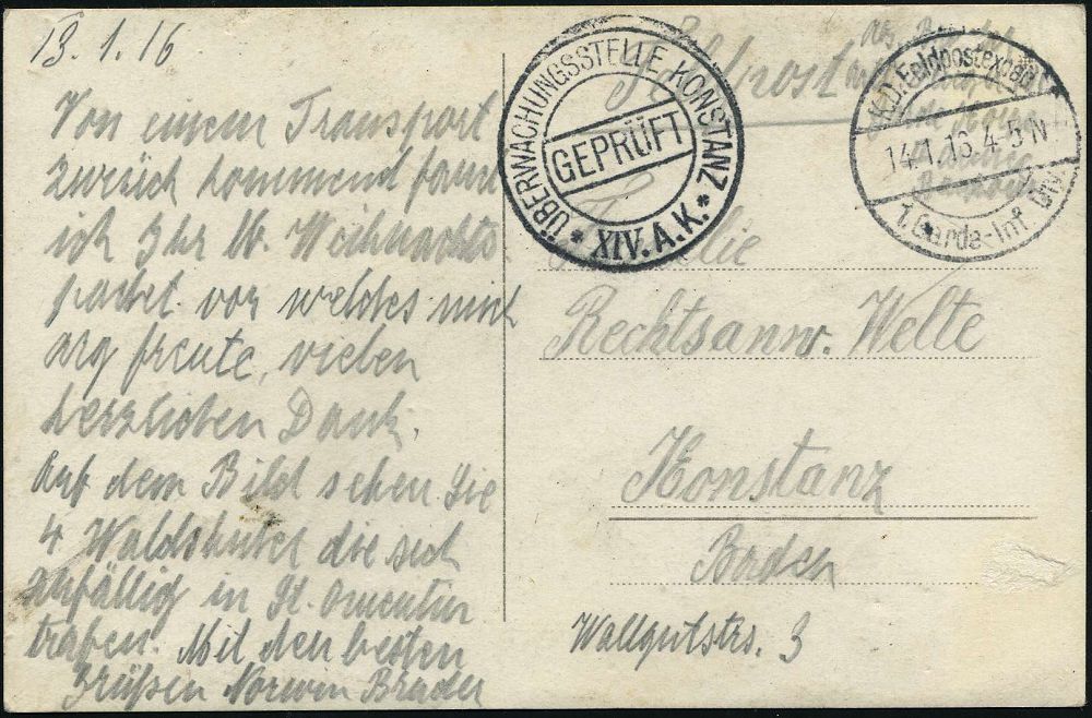 5427 | 16 € | POSTLEITRAUM 7700 (OHNE SINGEN) : Konstanz 1916 (14.1.) schw. Zensur-2K-Steg: ÜBERWACHUNGSSTELLE KONSTANZ/GEPRÜFT/XIV.A.K. (Rie.4) = Frühdatum! + 1K: K.D. Feldpostexped./ 1.Garde-Inf.Div., orig. individuelle s/w.-Soldaten-Foto-Feldpost-Ak. n. Konstanz | ![]() ![]() | |