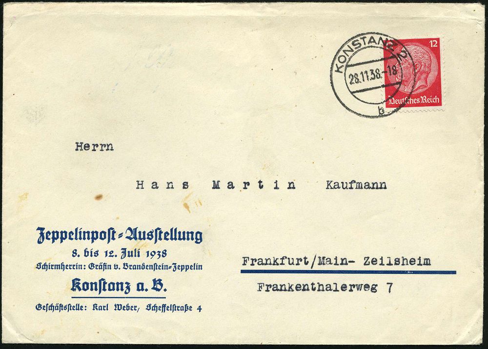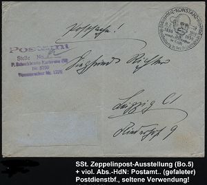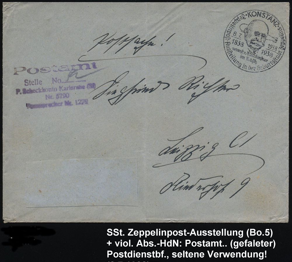 5437 | 18 € | POSTLEITRAUM 7700 (OHNE SINGEN) : KONSTANZ/ Zeppelinpost-Ausstellung.. 1938 (8.7.) SSt = Kopfbild Graf Zeppelin (u. Luftschiff) + viol. 5L: Postamt/Stelle No.... + hs. Eintrag, provis. Postdienstbf. (Antwort-Bf. daher schwache Mittelfalte) Fernbf. n. Leipzig (Bo.5) | ![]() | |