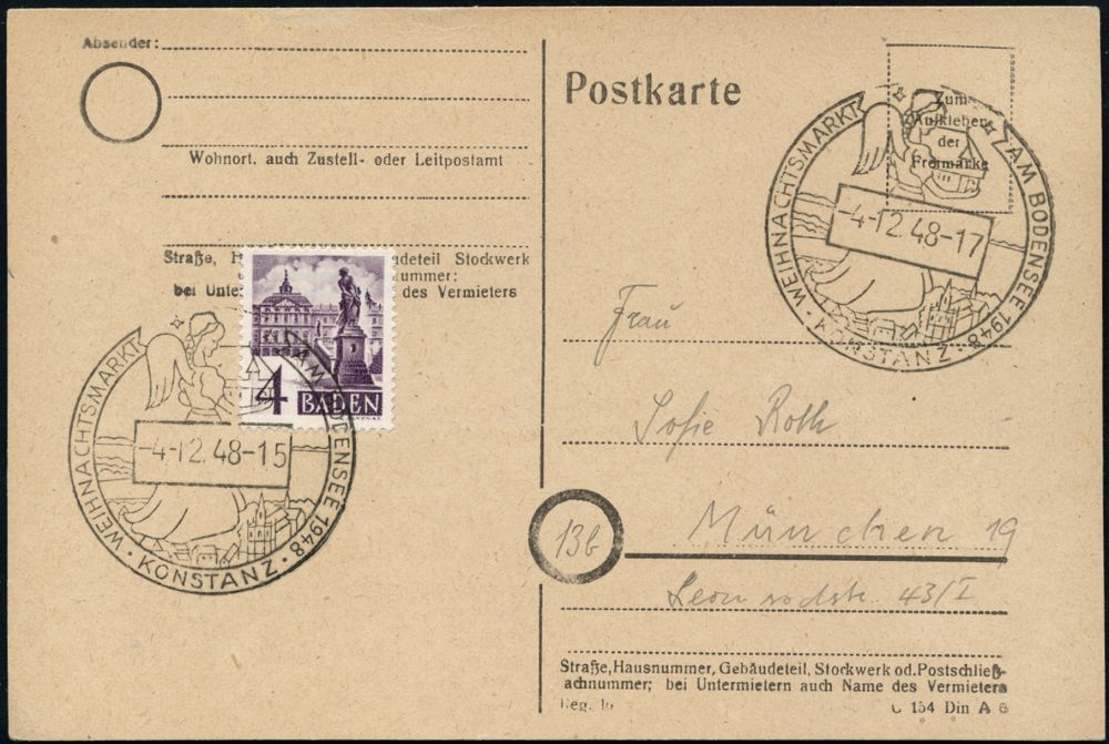 5440 | 15 € | POSTLEITRAUM 7700 (OHNE SINGEN) : KONSTANZ/ WEIHNACHTSMARKT AM BODENSEE 1948 1948 (4.12.) SSt = Engel (mit Konzilsgebäude) 2x klar auf Inl.-Drs.-Karte (Bo.13) | ![]() | |