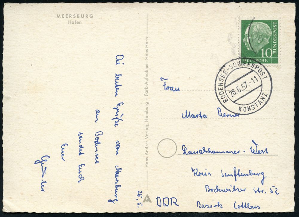 5444 | 20 € | POSTLEITRAUM 7700 (OHNE SINGEN) : KONSTANZ/ BODENSEE-SCHIFFSPOST 1957 (28.6.) 2K-Steg-Schiffs-Stpl. glasklar auf Color-Foto-Ak.: Meersburg, Dampferanlegestelle, Bedarf) in die DDR (Kat.-Nr.006) | ![]() ![]() | |