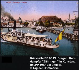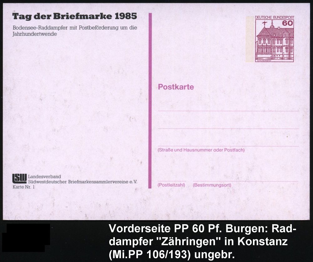 5450 | 8 € | POSTLEITRAUM 7700 (OHNE SINGEN) : 7750 Konstanz 1985 PP 60 Pf. Tag der Briefmarke, Postdampfer (Hafen, histor. Raddampfer, Konzilsgebäude) ungebr. (Mi. PP 106/193) | ![]() ![]() | |