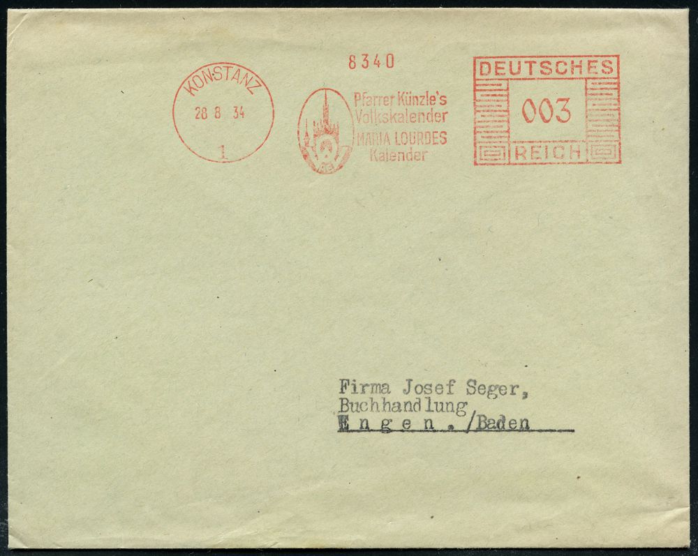 5452 | 25 € | POSTLEITRAUM 7700 (OHNE SINGEN) : KONSTANZ/ 1/ Pfarrer Künzle´s/ Volkskalender/ MARIA LOURDES/ Kalender 1934 (28.8.) seltener AFS Francotyp "Mäanderrechteck" (Monogr.-Logo mit Kirchturm) Inl.-Bf. (Dü.E-2CEh) | ![]() | |