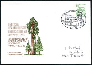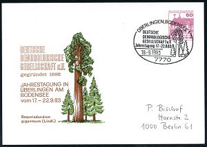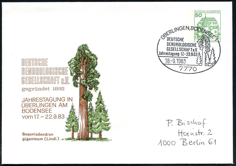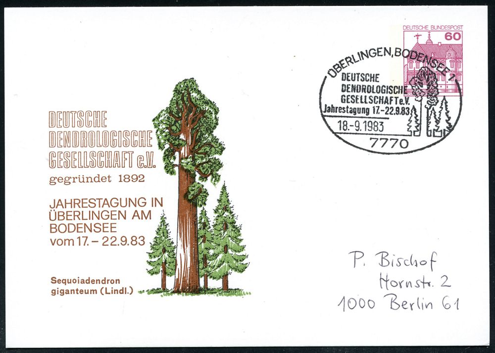 5532 | 20 € | POSTLEITRAUM 7700 (OHNE SINGEN) : 7770 ÜBERLINGEN,BODENSEE 1/ DEUTSCHE / DENDROLOG./ GES./ Jahrestagung 1983 (18.9.) SSt (= Mammut-Baum, Tannen) auf motivgl. PP 50 Pf. und PU 60 Pf. Burgen (Mi.PP 104, PU 114) 2 Belege! (Bo.15) | ![]() ![]() | |