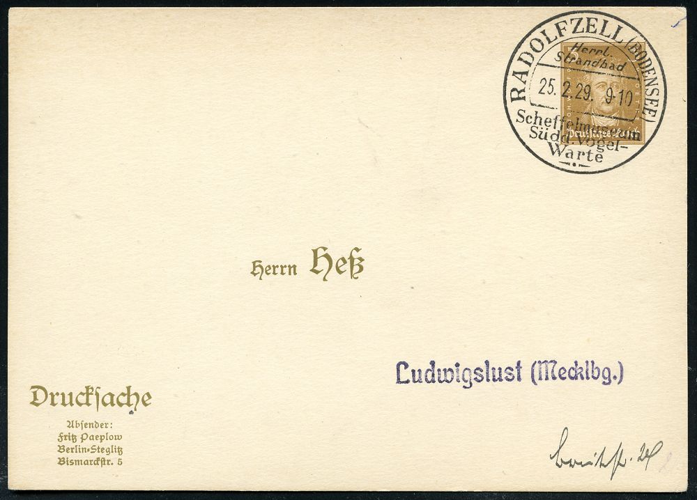 5485 | 25 € | POSTLEITRAUM 7700 (OHNE SINGEN) : RADOLFZELL (BODENSEE)/ Scheffelmuseum/ Südd.Vogel-/ Warte/ -°- 1929 (25.2.) seltener HWSt mitTilde = Ty.I auf PP 3 Pf. Goethe, braun (Heß, Mi.PP 97/B 6-027) klar gest.! (Bo.2 Type I = mit Tilde) | ![]() | |