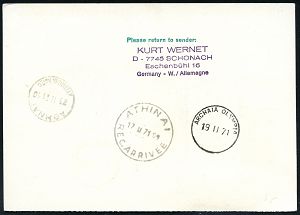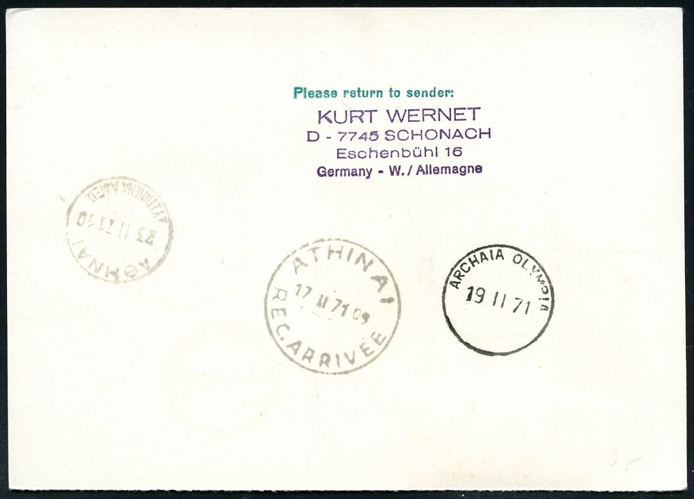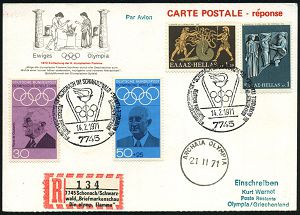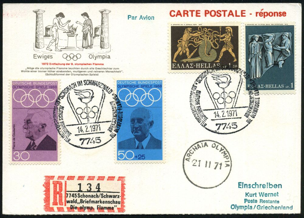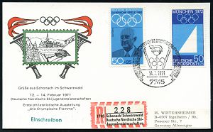 5507 | 30 € | POSTLEITRAUM 7700 (OHNE SINGEN) : 7745 SCHONACH IM SCHWARZWALD/ DT. NORRDISCHE/ SKI-JUGENDMEISTERSCHAFTEN 1971 (14.2.) SSt = olymp. Flamme, Olymp. Ringe, Ski auf MiF BRD Oly. Mi.563,565 + Griechenland (1K: ARCHAIA OLYMPIA) + Sonder-RZ: 7745 Schonach-Schwarz-/wald ,"Briefmarkenschau/ Die olymp.Flamme" (NEZ-Kat. Nr.104) zulässige Ausl.-R-Sonder-Karte n. Olympia! (Bo.5) | ![]() ![]() | |