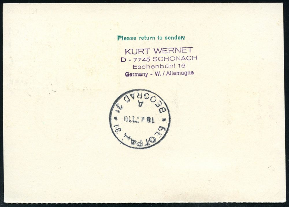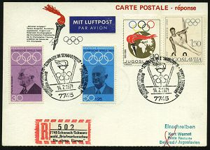 5508 | 30 € | POSTLEITRAUM 7700 (OHNE SINGEN) : 7745 SCHONACH IM SCHWARZW./ DT.NORDISCHE/ SKI-JUGENDMEISTERSCHAFTEN 1971 (14.2.) SSt = Olymp. Ringe, Flamme, Ski 2x a. MiF BRD Oly.Mi.563,565 + Jugoslawien Olympia-Zwangszuschlag (Oly.Mi.Zw.37,1292) + SRZ: 7745 Schonach-Schwarz-/wald, "Briefmarkenschau/ Die olymp.Flamme" (NEZ-Kat. Nr.104) zulässige Ausl.-Flp.-R-Sonder-Kt. n. Beograd , rs. AS (Bo.5) | ![]() ![]() | |