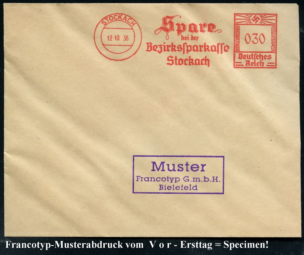 5515 | 35 € | POSTLEITRAUM 7700 (OHNE SINGEN) : STOCKACH/ Spare/ bei der/ Bezirkssparkasse/ Stockach 1938 (12.10.) AFS-Archiv-Muster Francotyp "Hakenkreuz" 030 Pf. , glasklar gest.Francotyp-Muster-Bf. vom V o r -Ersttag! (mit Attest), selten! (Dü.E-3CEo) | ![]() ![]() | |