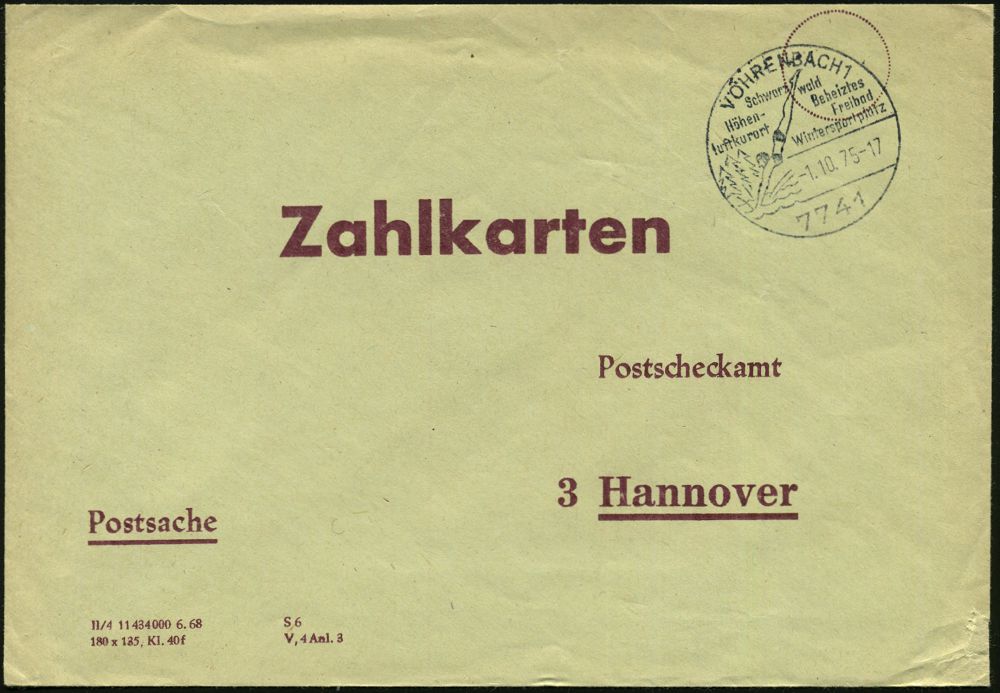 5552 | 15 € | POSTLEITRAUM 7700 (OHNE SINGEN) : 7741 VÖHRENBACH 1/ Schwarzwald/ Beheiztes/ Freibad/ Wintersportplatz 1975 (1.10.) HWSt = Springerin (u.Tannen) portofreier PSch-Innendienst-Bf.: "Zahlkarten" (br.lila/grün) für Zahlkarten-Austausch!, seltene Verwendung! (Bo.1 , Ty.II) | ![]() | |