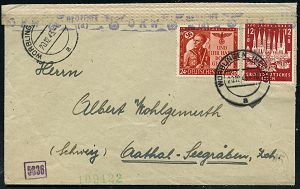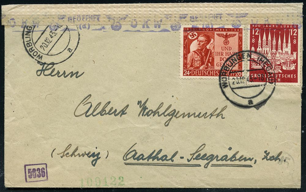 5553 | 20 € | POSTLEITRAUM 7700 (OHNE SINGEN) : WORBLINGEN (HEGAU)/ a 1943 (20.12.) 2K-Steg + lila Band-.Ma-Zensur OKW "d" = München (Rie.D-21 a) + neutraler Streifen (Bf. links kl. Öffnungsriß) Ausl.-Zensur-Bf. in.die Schweiz (Mi.862/63) | ![]() ![]() | |