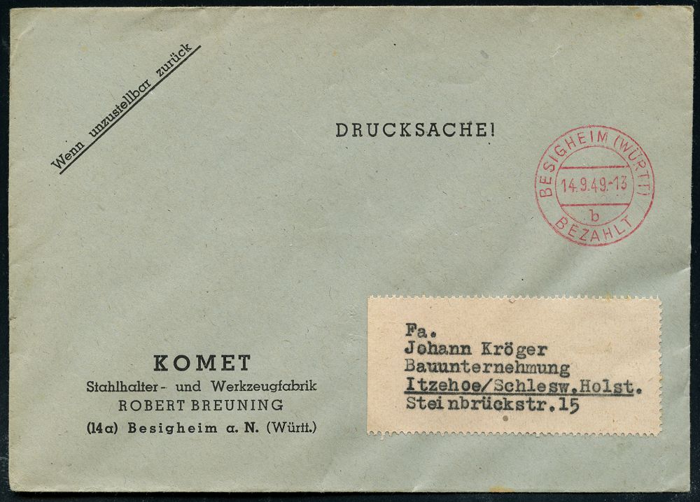 5374 | 8 € | POSTLEITRAUM 7700 (OHNE SINGEN) : BESIGHEIM (WÜRTT)/ b/ BEZAHLT 1949 (14.9.) 2K-Steg-PFS mit Uhrzeit auf Firmen-Bf.: KOMET Stahlhalter- u. Werkzeugfabrik, ROBERT BREUNING.. (Dü.A-7, Nr.32 b) | ![]() | |