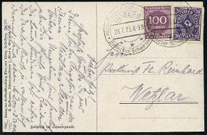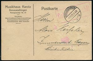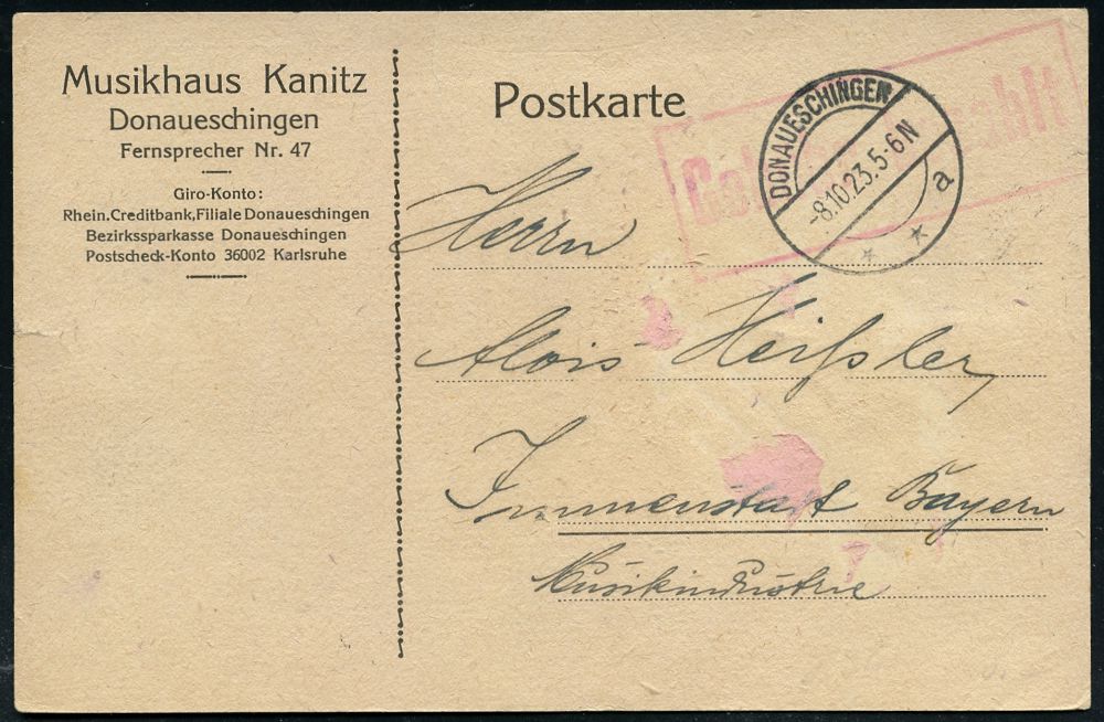 5379 | 18 € | POSTLEITRAUM 7700 (OHNE SINGEN) : DONAUESCHINGEN/ / **a 1923 (8.10.) 1K-Brücke + roter Ra.: Gebühr bezahlt (etw. schwach) = 800.000.- Mk., Infla-Firmen-Fern-Kt.: Musikhaus Kanitz.. n. Immenstadt | ![]() | |