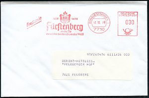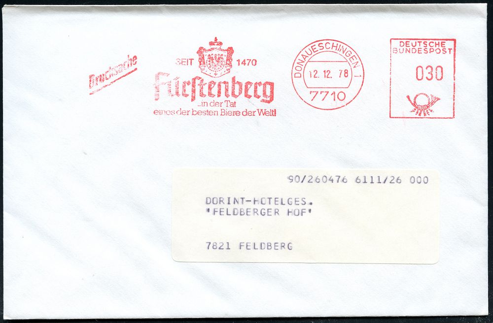 5383 | 10 € | POSTLEITRAUM 7700 (OHNE SINGEN) : 7710 DONAUESCHINGEN 1/ ..Fürstenberg../ eines der besten Biere der Welt! 1978 (12.12.) AFS Francotyp (Wappen) Fern-Bf. (Dü.E-26) | ![]() | |