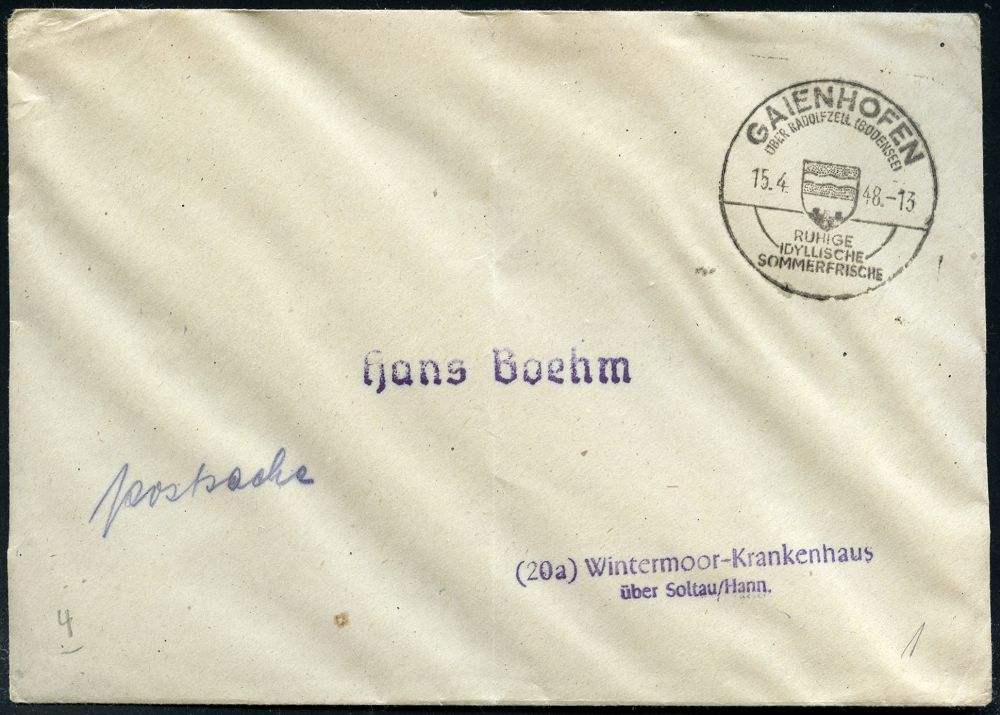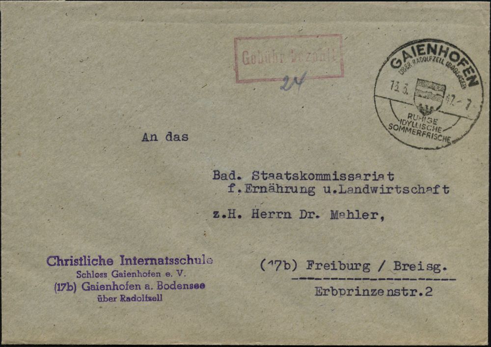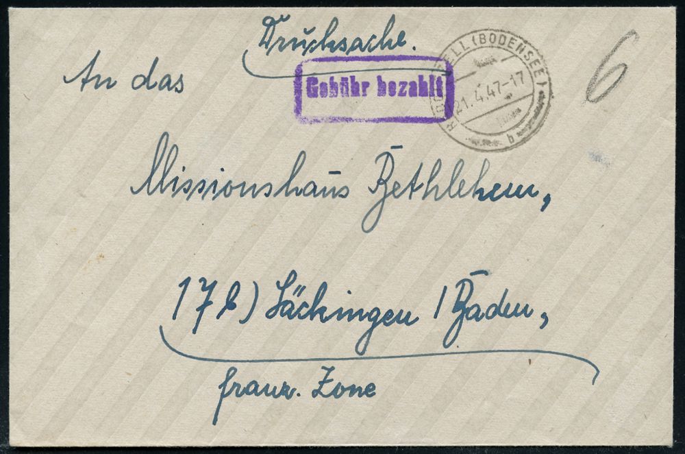 5391 | 15 € | POSTLEITRAUM 7700 (OHNE SINGEN) : GAIENHOFEN/ ÜBER RADOFZELL (BODENSEE)/ ..SOMMERFRISCHE 1947 (13.3.) HWSt = PSt. I + viol. Ra.: Gebühr bezahlt (Wappen), Abs.: Christl. Internatsschule Schloss Gaienhofen e.V..., Barfrankatur-Fern-Bf. (Bo.1) | ![]() | |