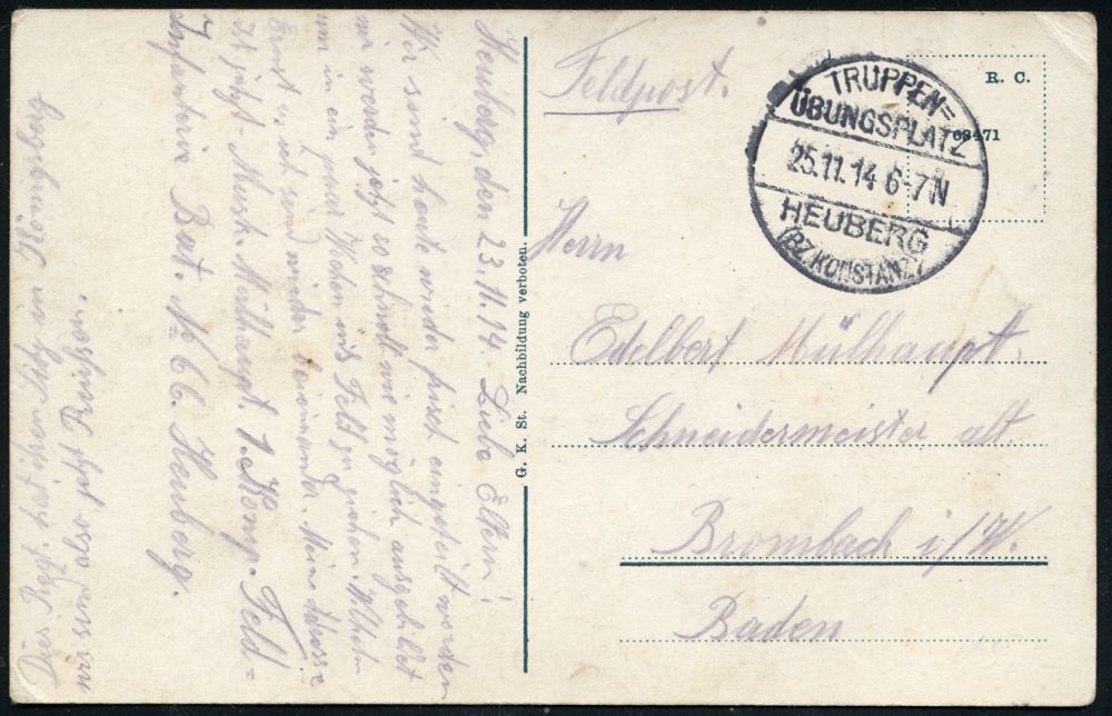 5396 | 12 € | POSTLEITRAUM 7700 (OHNE SINGEN) : HEUBERG/ (BZ.KONSTANZ)/ TRUPPEN=/ ÜBUNGSPLATZ 1914 (25.11.) 1K-Brücke + hs. Abs.: "..Feld-Jnfantrie Bat. No.66.. Dies Regt. hat ihren Sitz in Königsberg.." , klar gest. Color-Feldpost-Ak.: Panorama mit TrüPl. Heuberg (kl. Beförd.-Spuren) n. Brombach | ![]() ![]() | |