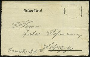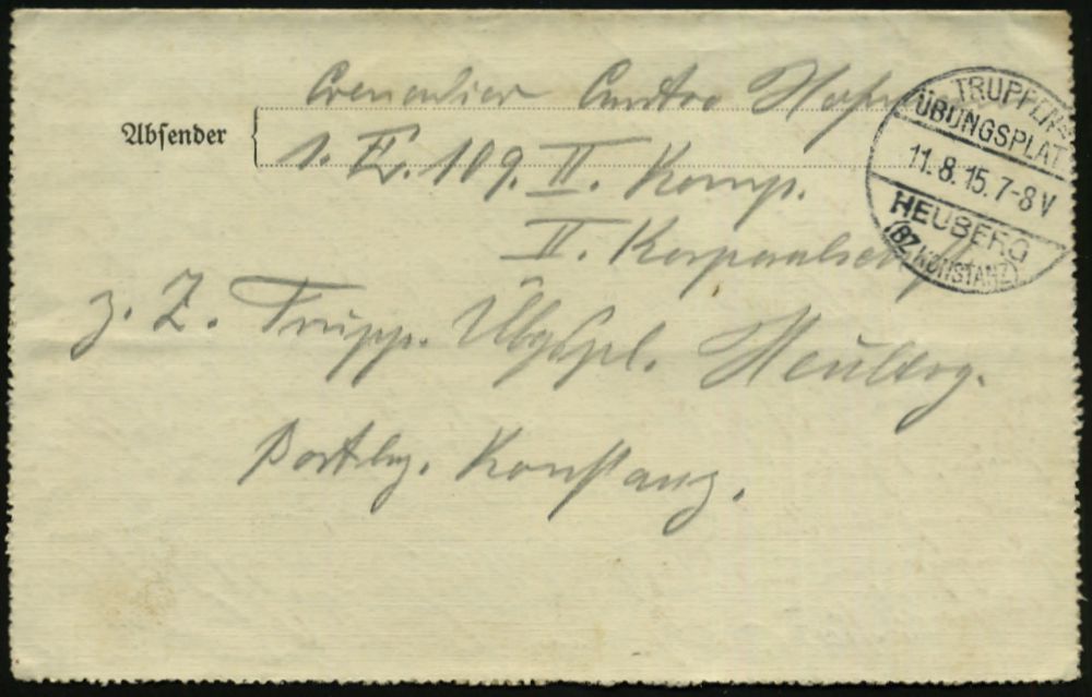 5397 | 15 € | POSTLEITRAUM 7700 (OHNE SINGEN) : HEUBERG/ (BZ.KONSTANZ)/ TRUPPEN-/ ÜBUNGSPLATZ 1915 (11.8.) 1K-Brücke, Aufgabestempel irrtümlich auf Absenderseite Feldpost-Faltbf. , hs. Abs.: ".. z. Zt. Trupp.(en) Übungspl. Heuberg..", Feldpost-Faltbf. (n. Leipzig) | ![]() ![]() | |