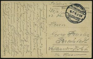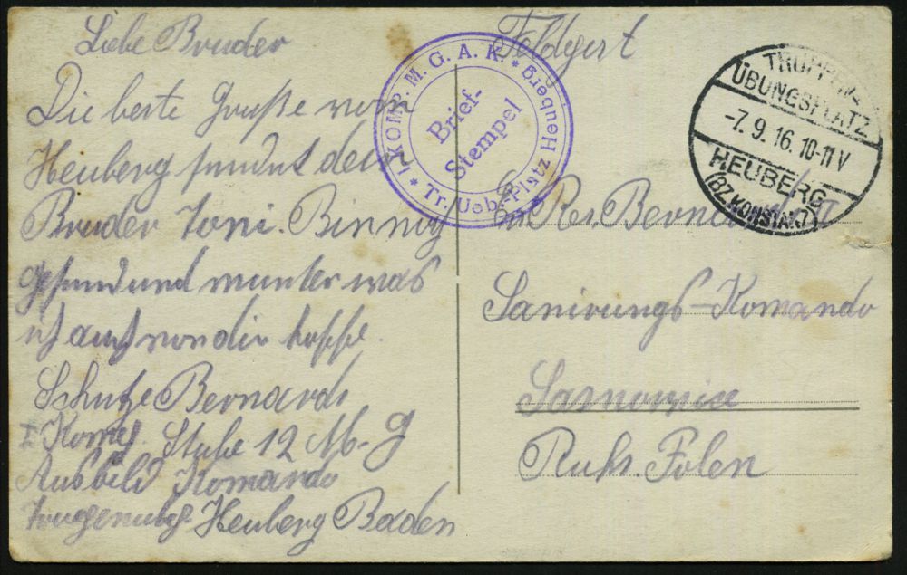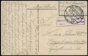 5401 | 20 € | POSTLEITRAUM 7700 (OHNE SINGEN) : HEUBERG/ TRUPPEN=/ ÜBUNGSPLATZ/ (BZ.KONSTANZ) 1916 (7.9.) 1K-Brücke + viol. 3K-HdN: I. KOMP. M.G. A.K./ Tr. Ueb.-Platz Heuberg = MG-Ausb.-Komp. (= MG-Ausb.-Kompanie) auf individueller s/w.-Foto-Feldpost-Ak.: Teilnehmer Gruppen-Foto (kl. Riß, Fleck) + weitere ungebr. Foto-Ak. (Nov. 1916), 2 Belege | ![]() ![]() ![]() | |
