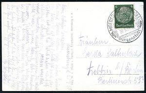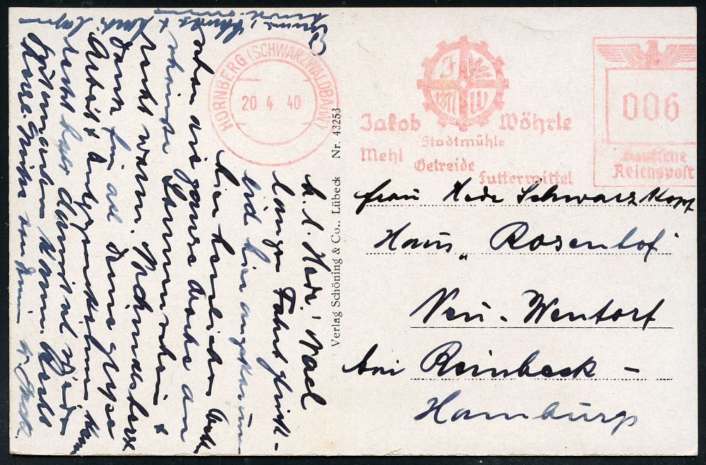 5407 | 28 € | POSTLEITRAUM 7700 (OHNE SINGEN) : HORNBERG (SCHWARZWALDBAHN)/ J W/ Jakob Wöhrle/ Stadtmühle/ Mehl/ Getreide/ Futtermittel 1940 (20.4.) AFS Francotyp "Reichsadler" 006 Pf. auf individueller s/w.-Foto-Ak.: Heuberg, Blick vom Bürgermeister Vogel Platz , hs. Text eines Mitarbeiters = postalisch eigentlich unzulässig, wurde hier offenbar geduldet, seltene Variante, Fern-Kt., vergl. Kat.-Nr.5406 (Dü.E-5CGo) | ![]() ![]() | |