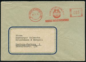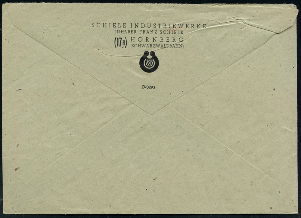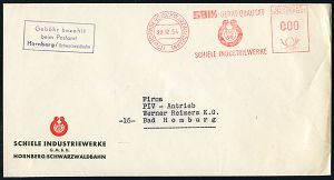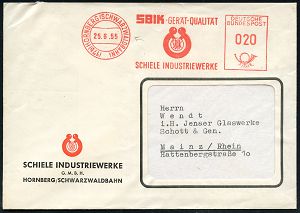 5410 | 15 € | POSTLEITRAUM 7700 (OHNE SINGEN) : (17b) HORNBERG (SCHWARZWALDBAHN)/ SBIK-GERÄTE-QUALITÄT/ SCHIELE INDUSTRIEWERKE 1955 (25.6.) AFS Francotyp (Firmen-Logo) motivgl., klar gest. Inl.-Bf., vergl. Kat.-Nr.5405, 5408-10 (Dü.E-23CO) | ![]() | |