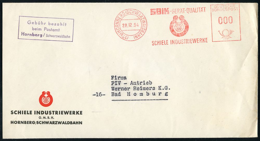 5409 | 18 € | POSTLEITRAUM 7700 (OHNE SINGEN) : (17b) HORNBERG (SCHWARZWALDBAHN)/ SBIK-GERÄT-QUALITÄT/ SCHIELE INDUSTRIEWERKE 1954 (8.12.) AFS Francotyp in 000 + viol. Ra.: Gebühr bezahlt/beim Postamt/Hornberg/ Schwarzwaldbahn = Massen-Drs.! (Firmen-Logo) motivgl. (gering links verkürzter) Firmen-Bf. (Dü.E-23CO) | ![]() | |