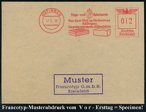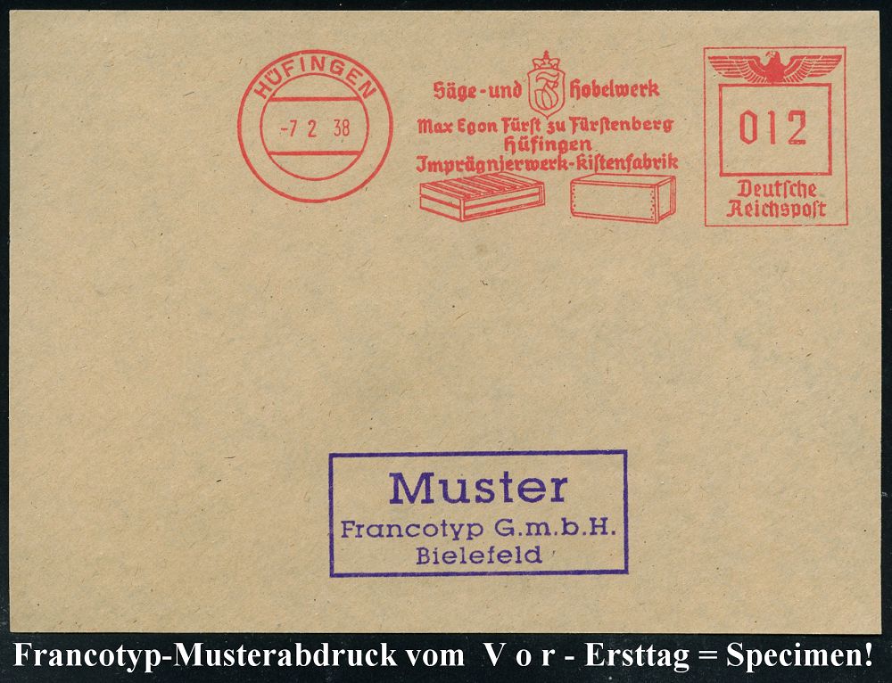 5415 | 35 € | POSTLEITRAUM 7700 (OHNE SINGEN) : HÜFINGEN/ Säge-u.Hobelwerk/ Max Egon Fürst zu Fürstenberg../ Jmprägnierwerk-Kistenfabrik 1938 (7.2.) AFS-Musterabdruck Francotyp "Reichsadler" (Holzkisten) gklasklar gest. Francotyp-Musterblatt vom V o r - Ersttag ! (mit Attest), selten! (Dü.E-5CGo) | ![]() ![]() | |