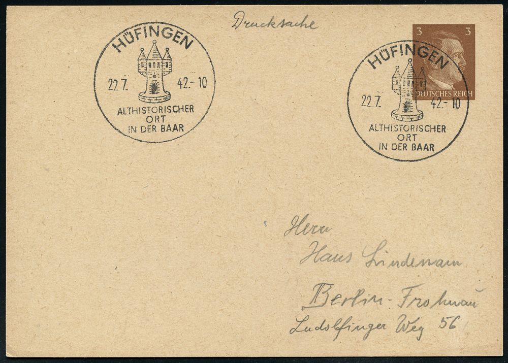 5416 | 18 € | POSTLEITRAUM 7700 (OHNE SINGEN) : HÜFINGEN/ ALTHISTRORISCHER/ ORT/ AN DER BAAR 1942 (22.7.) HWSt = Turm (Wappen) auf PP 3 Pf. Hitler, braun (blanco = Mi.PP 152/A 1) Inl.-Karte (Bo.1, Erstjahr) | ![]() | |