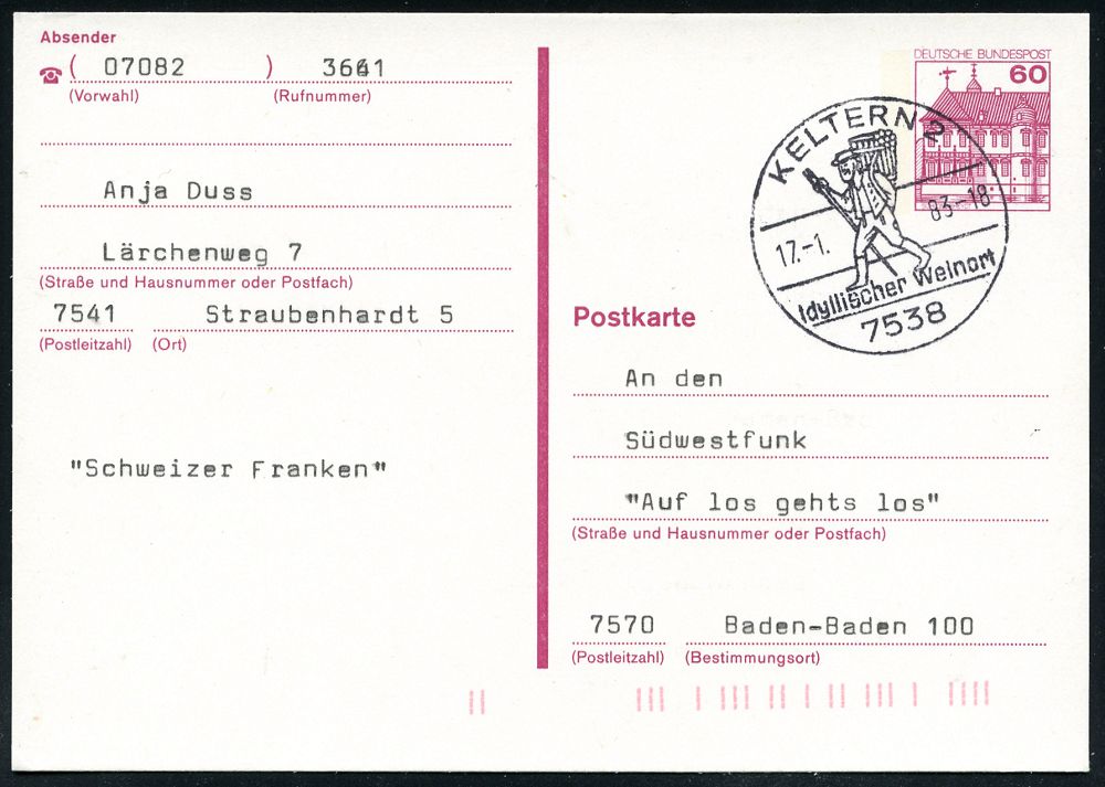 5421 | 6 € | POSTLEITRAUM 7700 (OHNE SINGEN) : 7538 KELTERN 2/ Idyllischer Weinort 1983 (17.1.) HWSt (histor. Weinbauer m.Kiepe u.Wanderstock) Bedarfs-Kt. | ![]() | |