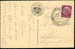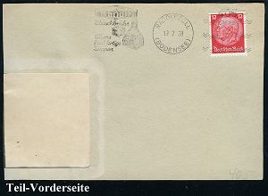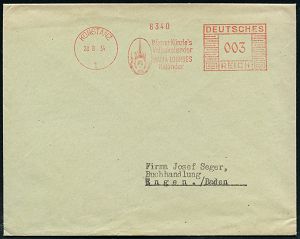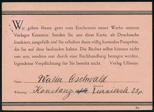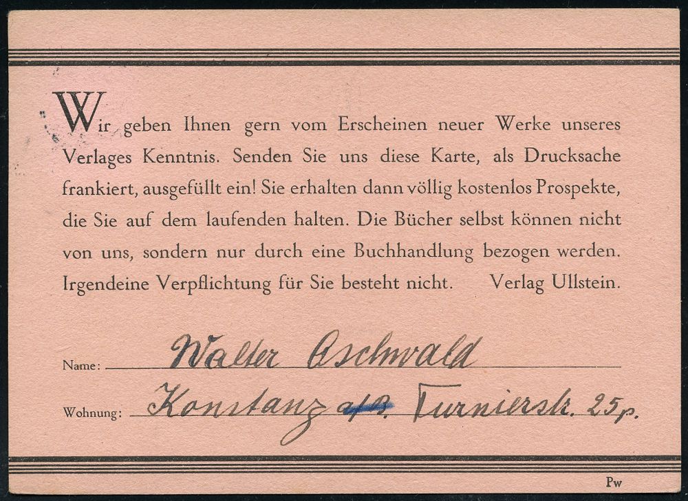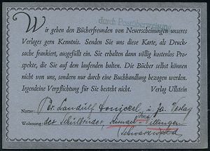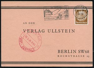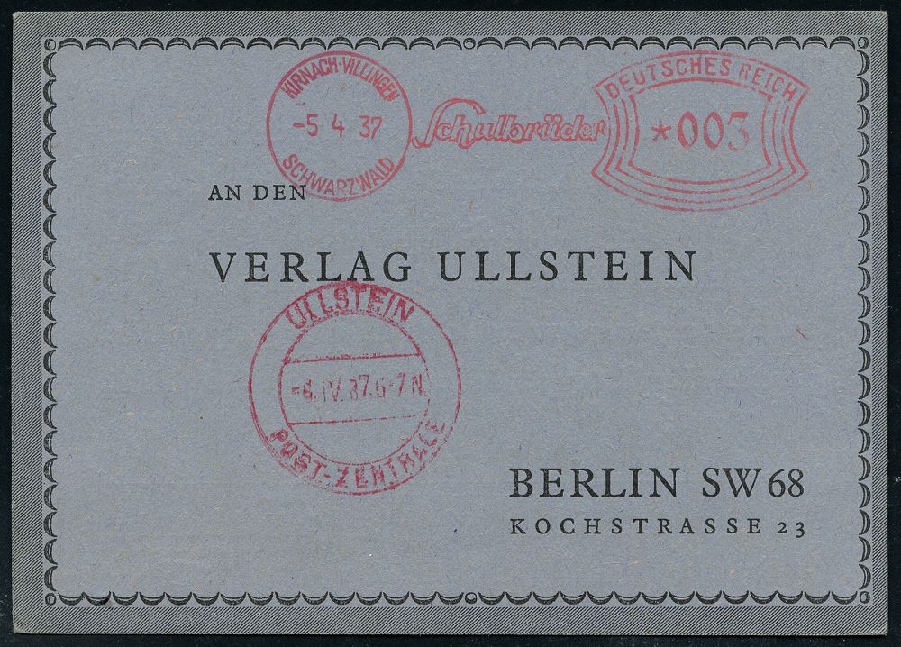 5422 | 30 € | POSTLEITRAUM 7700 (OHNE SINGEN) : KIRNACH-VILLINGEN/ Schulbrüder 1937 (5.4.) AFS Francotyp "Bogenrechteck" = "Verlag der Schulbrüder" auf Reklame-Kt.: VERLAG ULLSTEIN, vs. roter Posteingands-2K-Steg: ULLSTEIN POST-ZENTRALE = jüdischer Verlag von den Nazis enteignet und durch Tarnfirma "Cautio" zwangs-"arisiert", später umbenannt in DEUTSCHER VERLAG, seltener Beleg! (Dü.E-1Ao) | ![]() ![]() | |