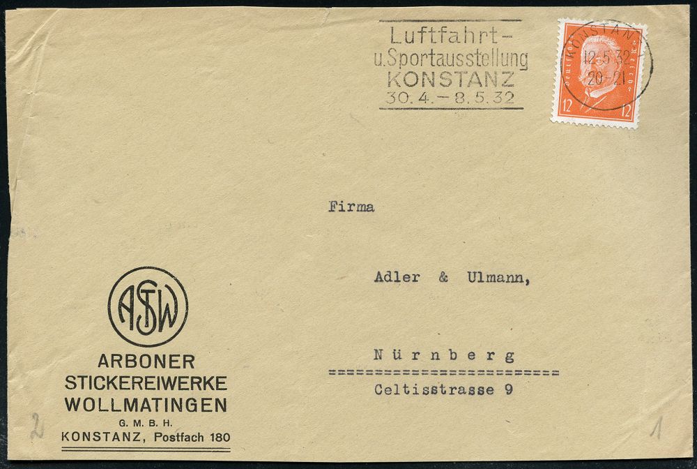 5432 | 20 € | POSTLEITRAUM 7700 (OHNE SINGEN) : KONSTANZ 1/ Luftfahrt-/ u.Sportausstellung 1932 (12.5.) MWSt auf Firmen-Bf.: ASTW, ARBONER STICKWERKE wollmatingen.. n. Nürnberg (Bo.1 A) | ![]() | |