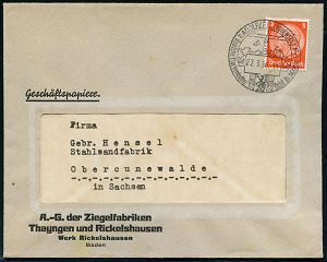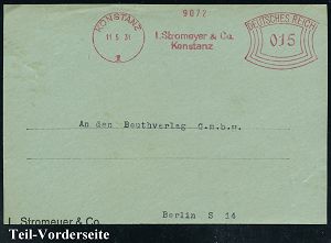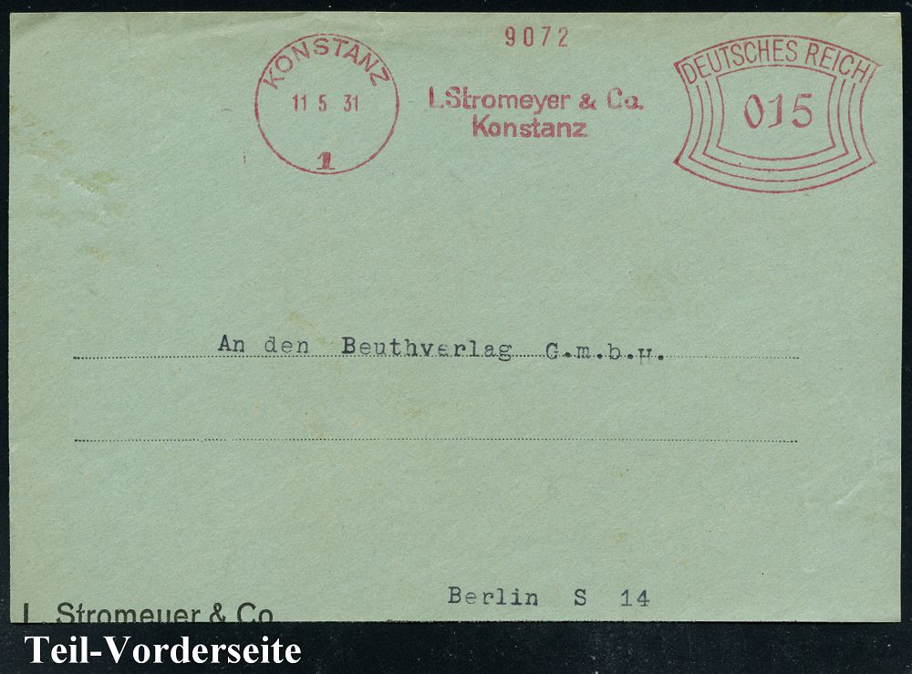 5451 | 14 € | POSTLEITRAUM 7700 (OHNE SINGEN) : KONSTANZ/ 1/ L.Stromeyer & Co.. 1931 (11.5.) AFS Francotyp "Bogenrechteck" auf Teil-Vorderseite (Dü.E-1CEh) | ![]() | |