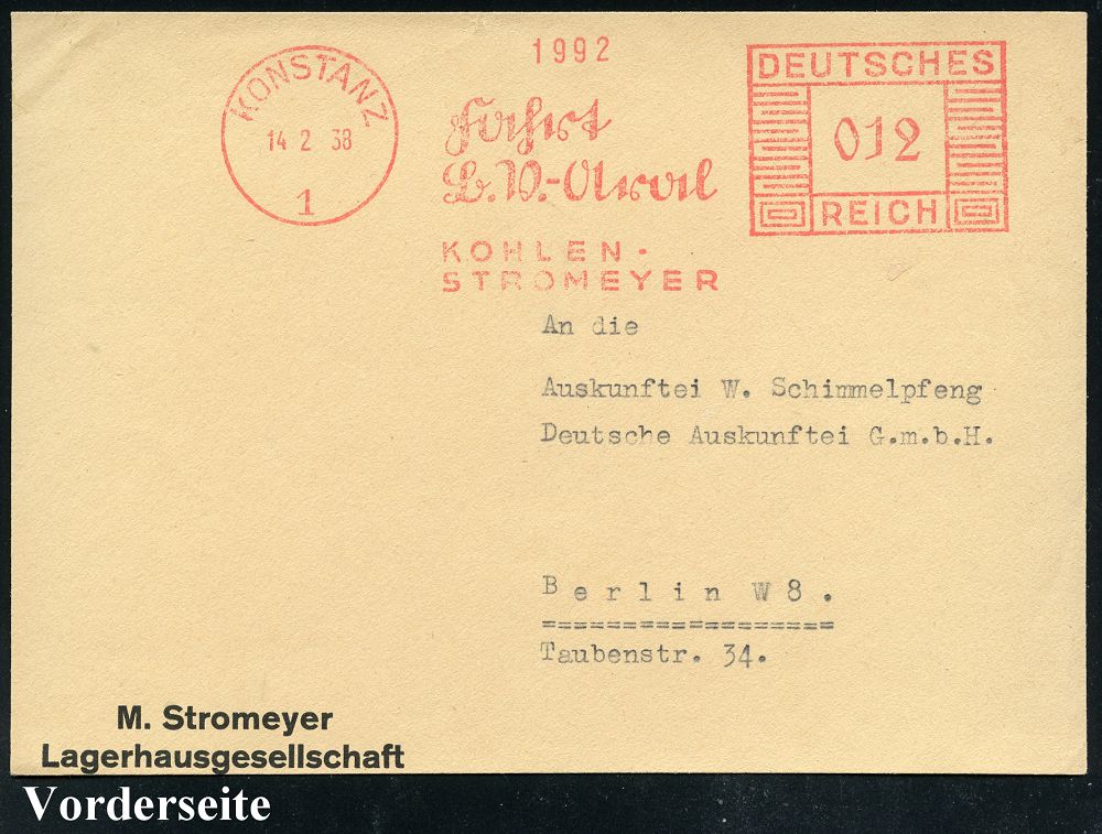 5454 | 15 € | POSTLEITRAUM 7700 (OHNE SINGEN) : KONSTANZ/ 1/ Fahrt/ B.V.-Aral/ KOHLEN-/ STROMEYER 1938 (14.2.) AFS Francotyp "Mäanderrechteck" , Text teils Sütterlin, Firmen-Vorderseite: M. Stromeyer Lagerhausgesellschaft (Dü.E-2CEh) | ![]() | |