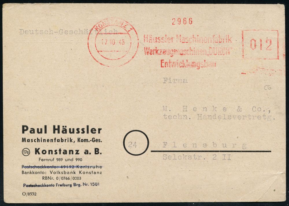 5459 | 25 € | POSTLEITRAUM 7700 (OHNE SINGEN) : KONSTANZ 1/ Häussler-Maschinenfabrik/ Werkzeugmaschinen "DUROH".. 1946 (17.10.) aptierter AFS Francotyp "Reichsadler" = entfernt u.a. = Notmaßnahme! , Firmen-Kt.; Paul Häussler.. n. Flensburg (Dü.E-13-AU-129h) | ![]() | |