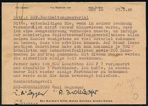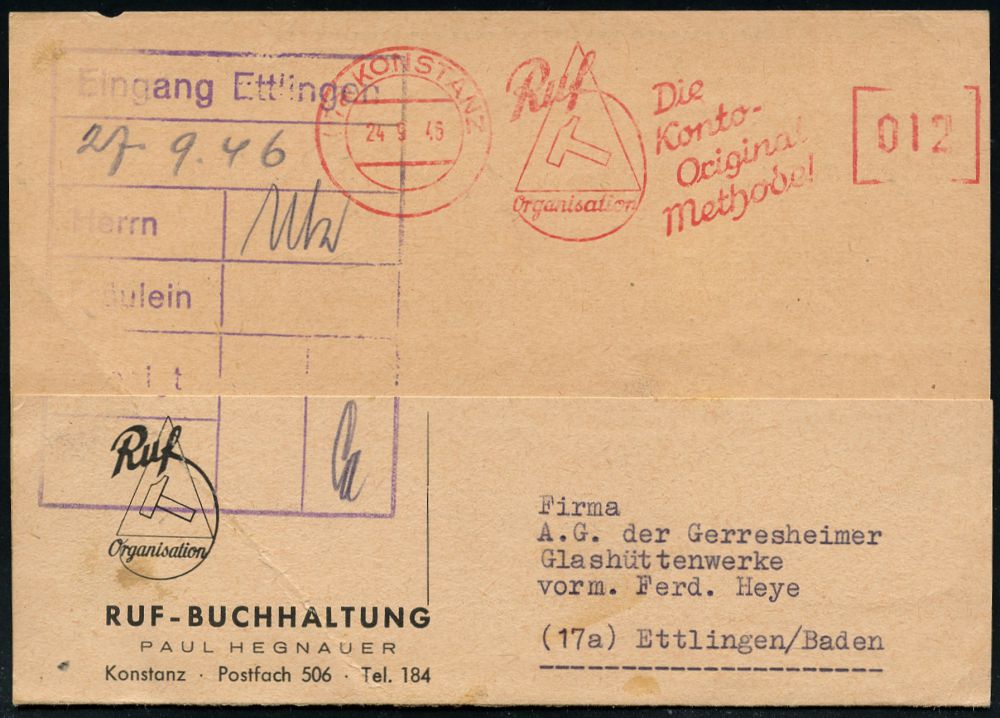 5460 | 20 € | POSTLEITRAUM 7700 (OHNE SINGEN) : (17a) KONSTANZ/ Ruf/ Die/ Konto-/ Original/ Methode 1946 (24.9.) aptierter AFS Francotyp "Reichsadler" = entfernt etc. = Notmaßnahme! (Firmen-Logo) Firmen-Kt.: RUF-BUCHHALTUNG (Bugspur) mit Text über Papier-Knappheit (Dü.E-13 AU-129h) | ![]() ![]() | |