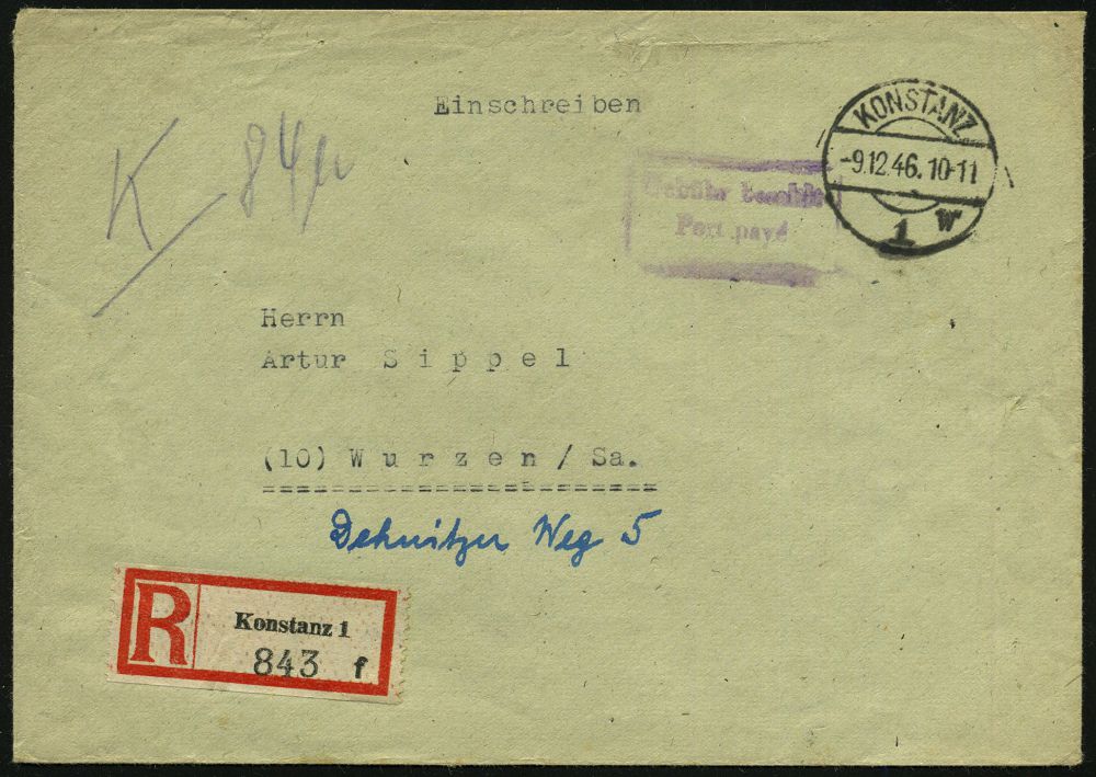 5461 | 15 € | POSTLEITRAUM 7700 (OHNE SINGEN) : KONSTANZ/ 1/ w 1946 (9.12.) 1K-Brücke + viol. Ra.2: Gebühr bezahlt / Port payé + RZ: Konstanz 1 / f , Fern-R-Bf. n. Wurzen, SBZ, rs. AS. | ![]() | |