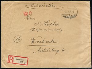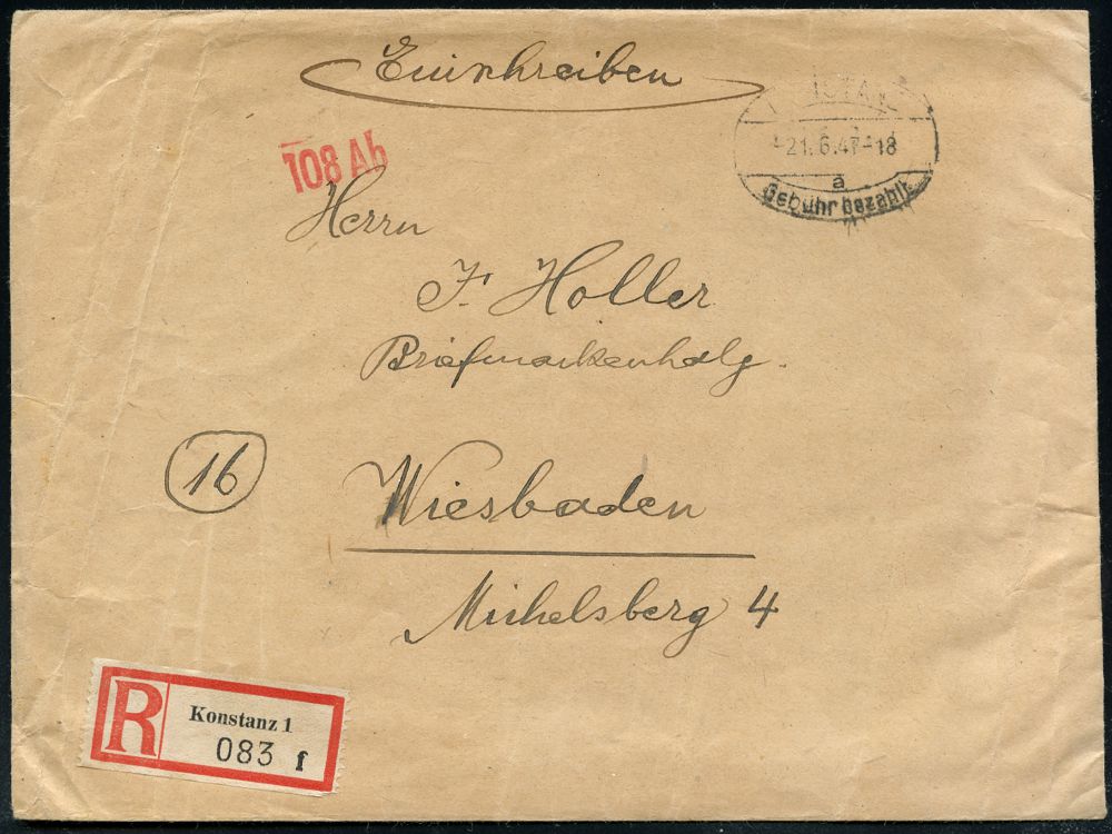 5462 | 20 € | POSTLEITRAUM 7700 (OHNE SINGEN) : KONSTANZ/ a/ Gebühr bezahlt 1947 (21.6.) schw. Oval-Brücken-PFS (im Ort teils etw. undeutl.) + roter 1L: 108 AB = Porto! RZ: Konstanz 1/f , Inl.-Fern-R-Bf. n. Wiesbaden (Dü.A-5, Nr.17 schw.) | ![]() | |