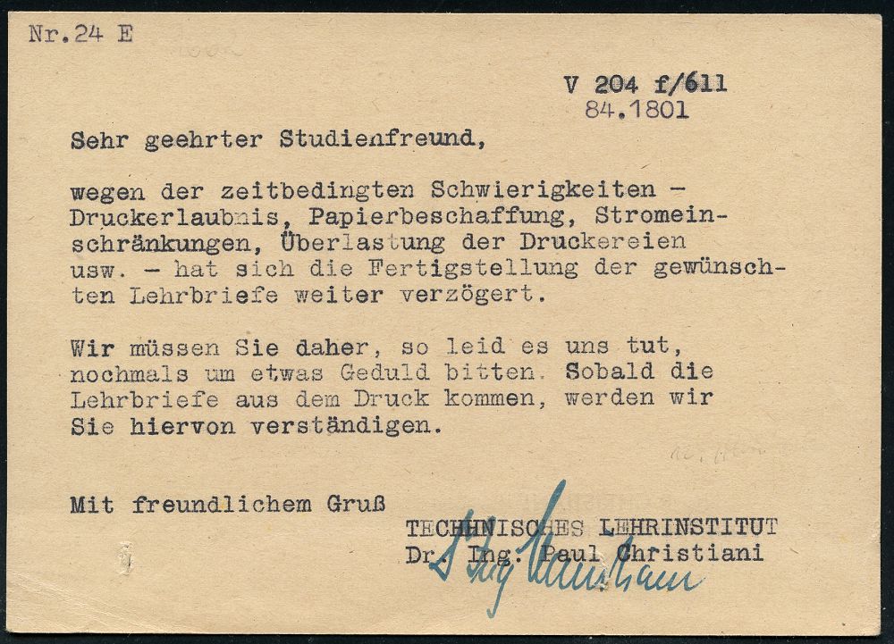 5463 | 40 € | POSTLEITRAUM 7700 (OHNE SINGEN) : KONSTANZ 1/ DR.-ING.CHRISTIANI.. 1947 (7.7.) seltener, aptierer AFS Francotyp "Hakenkreuz" = entfernt + Inschrift "Deutsches Reich" = Notmaßnahmme! , Firmen-Kt. DR.-ING. P. CHRISTIANI, TECHN. FERNUNTERRICHT, interess. Text über Materialknappheit, Strromeinschränkung etc., Fern-Kt. n. Wesermünde, vergl. Kat.-Nr.5455-56 (Dü.E-12 AB-98h = sehr seltene Type!) | ![]() ![]() | |